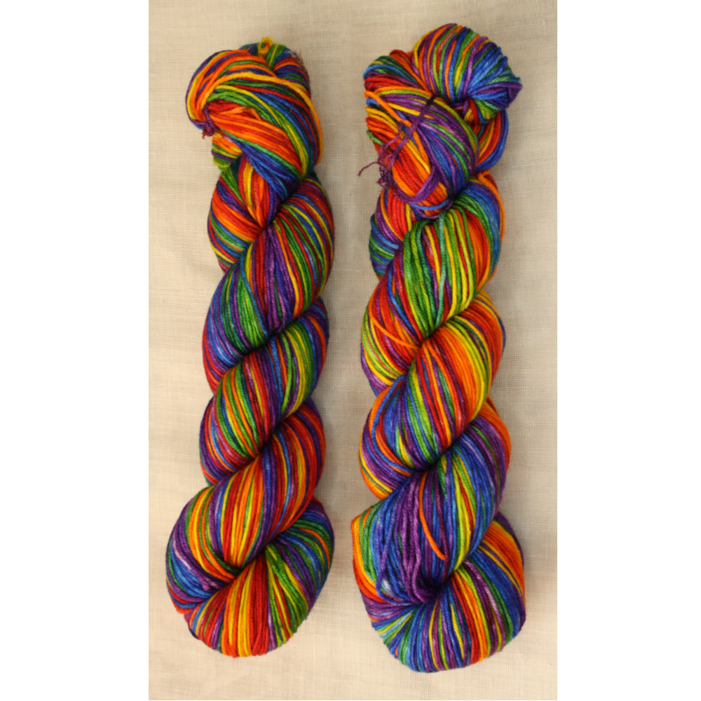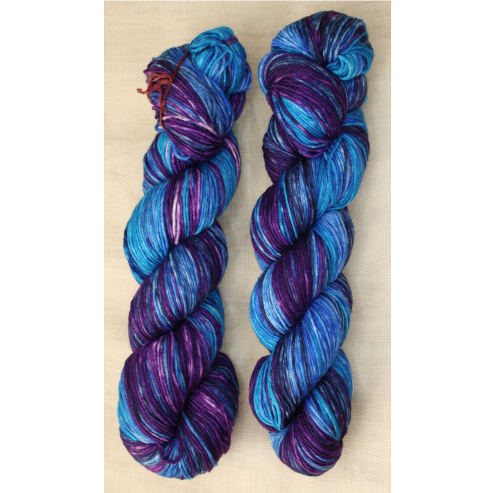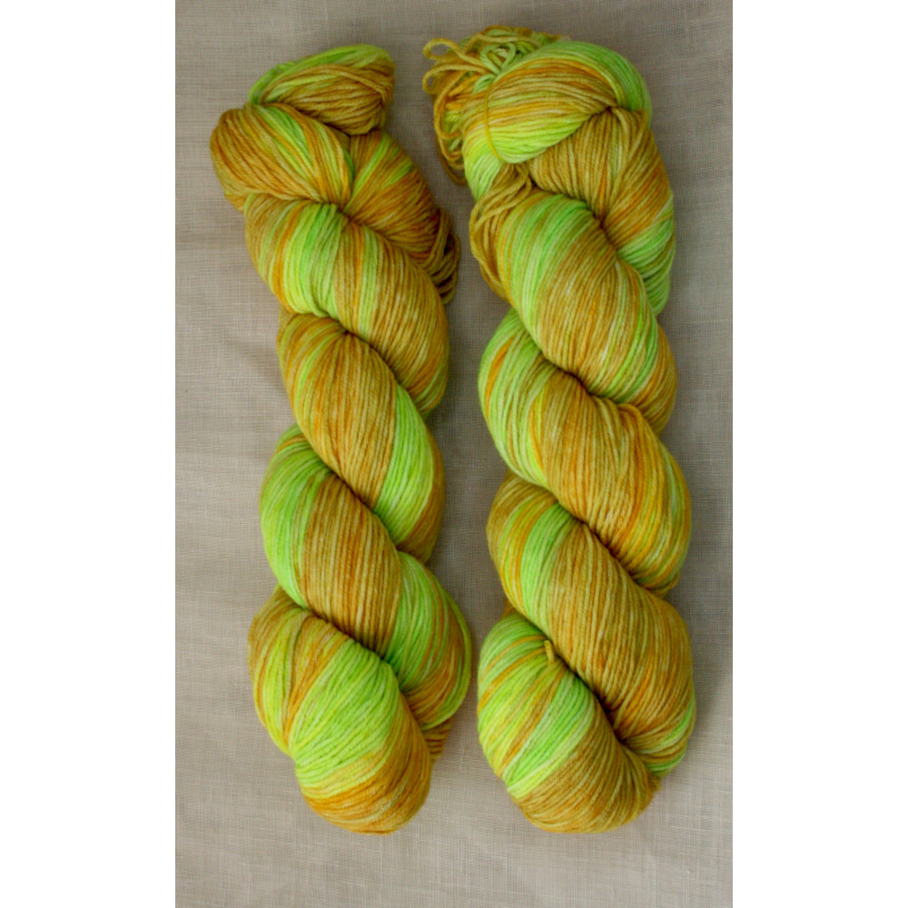 Käsinvärjätty 75% SW Merino ja 25% Polyamidi-sukkalanka, kaksi samanlaista 50g:n vyyhtiä.